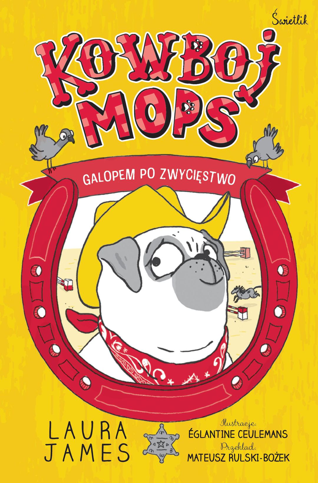 „Przygody Mopsa” autorstwa Laury James to seria zabawnych opowieści o sympatycznym Mopsie i jego opiekunce, Pannie Mirandzie. Tym razem Panna Miranda postanawia, że Mops zostanie kowbojem, i wspólnie wyrusząją na Dziki Zachód, aby pokonać bandytów. Wszystko idzie gładko, dopóki drewniany Kuc nie pęka na pół i dziewczynka ze świata wyobraźni musi wrócić do rzeczywistości, a zniszczona zabawka staje się pretekstem do poszukiwań i zakupu prawdziwego konia. Kiedy Panna Miranda poznaje Konika, zaczynają się dziać niesamowite rzeczy - Mops, jak na prawdziwego kowboja przystało, musi wziąć udział w zawodach w skokach przez przeszkody! Ale co z jego strachem przed jazdą konno? Seria nieoczekiwanych zdarzeń prowadzi do zabawnych sytuacji, wywołując mnóstwo śmiechu podczas czytania.
